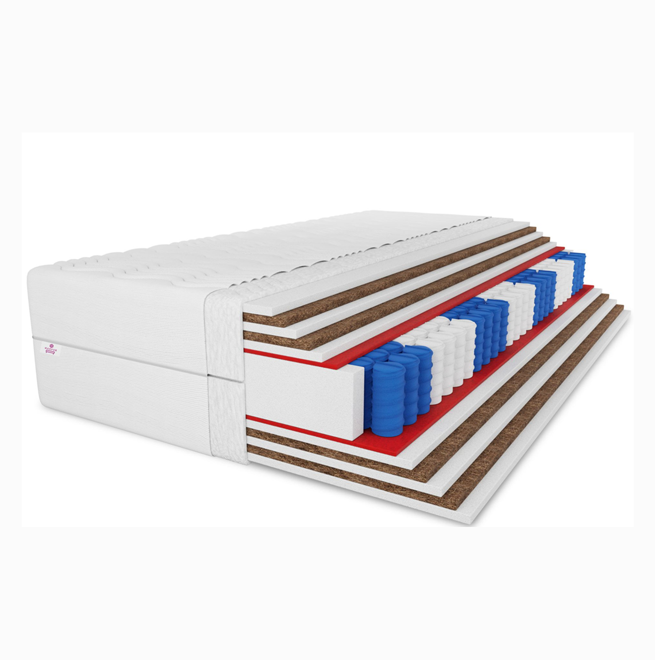 Sercem materaca są sprężyny kieszeniowe bonellowe o wysokości 12 cm, które pracują niezależnie, równomiernie rozkładając nacisk. Ich otoczenie stanowią warstwy utwardzające – filc i mata kokosowa – zwiększające sztywność oraz odporność na odkształcenia.